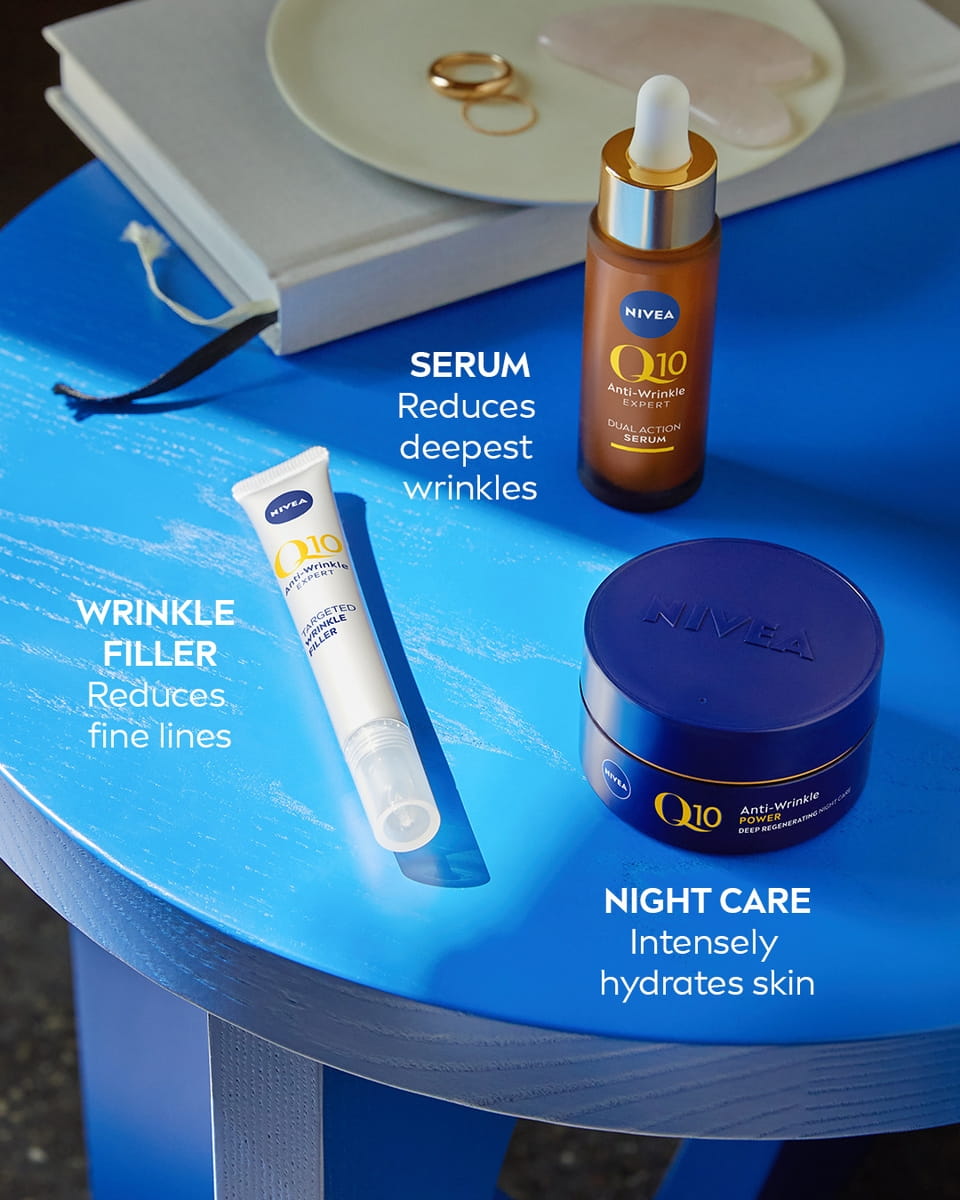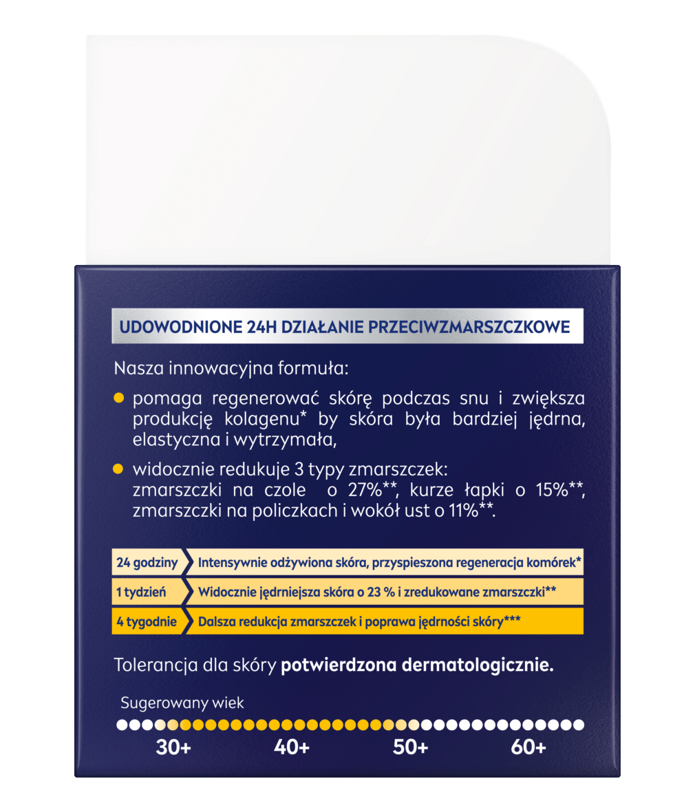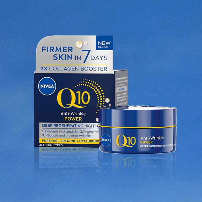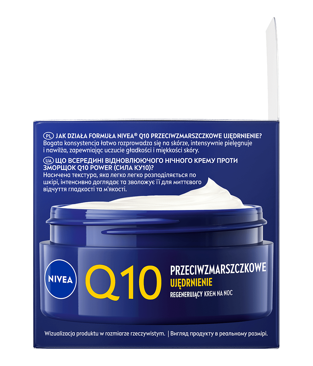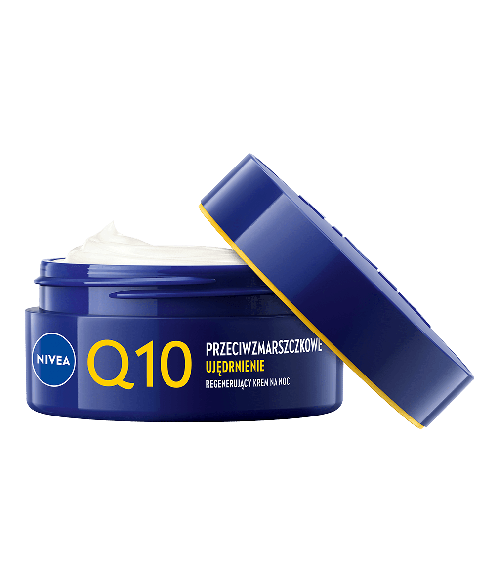 NIVEA Q10 PRZECIZMARSZCZKOWE UJĘDRNIENIE Regenerujący krem na noc dla wszystkich typów skóry zawiera najczystszy, w 100% identyczny jak w skórze Koenzym Q10, Kreatynę i GLYCOSTOP®. Intensywnie pielęgnuje i nawilża, dzięki temu mamy gładką i miękką skórę. Redukuje zmarszczki już w 7 dni z GLYCOSTOP®!