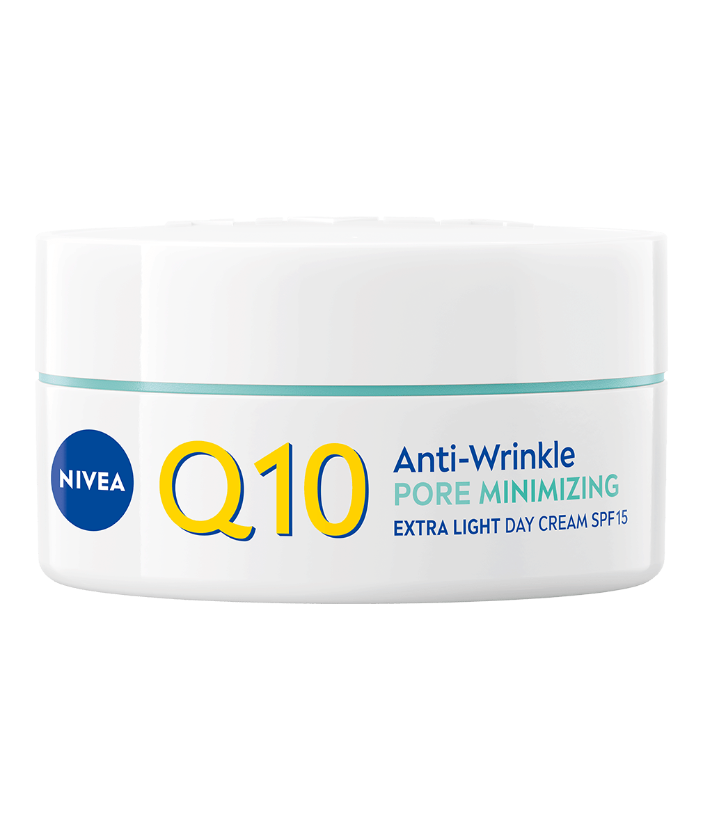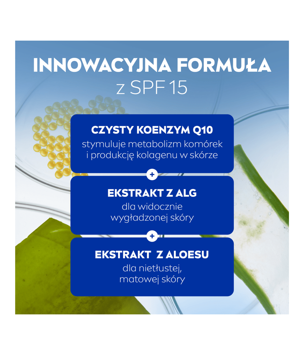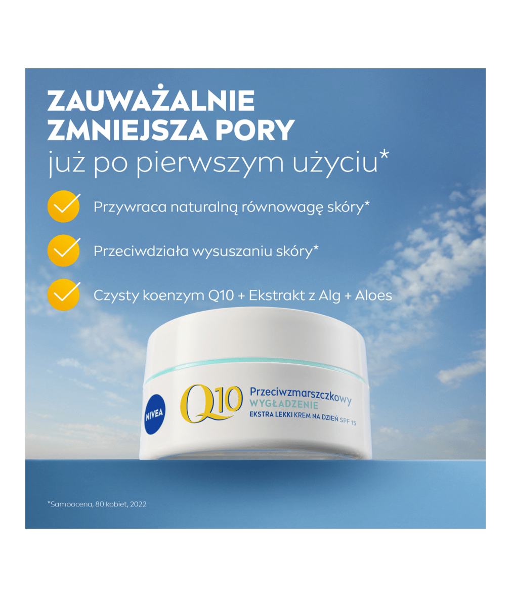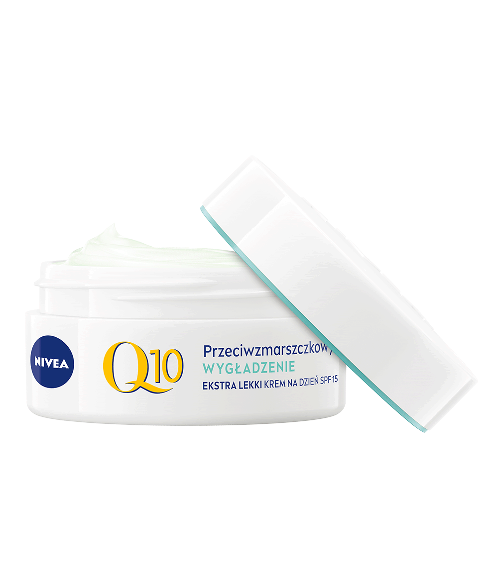 NIVEA Q10 PRZECIWZMARSZCZKOWE WYGŁADZENIE Ekstra lekki krem na dzień dla skóry mieszanej z SPF15 nawilża, ujędrnia skórę i zmniejsza widoczność porów jednocześnie redukując zmarszczki. Matowa i jednolita skóra. Efekty widoczne po 24 godzinach**.