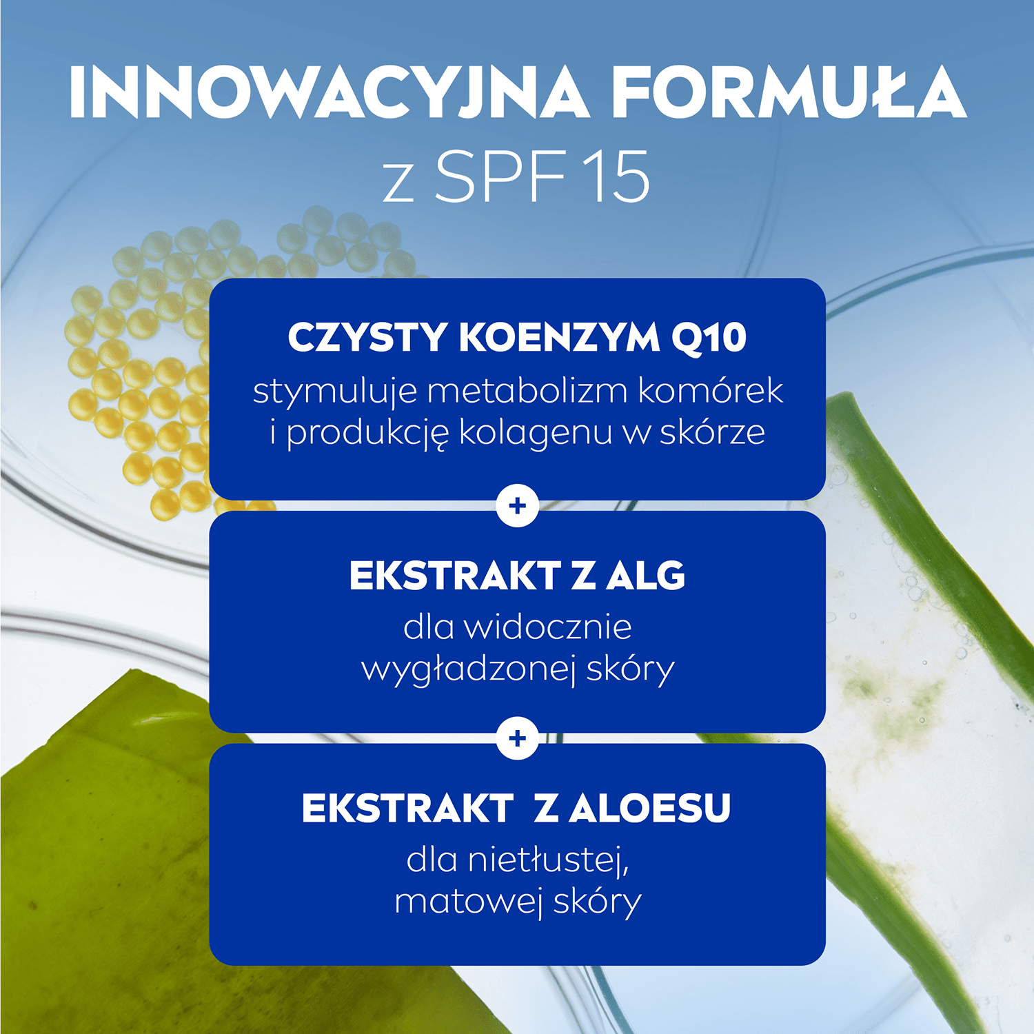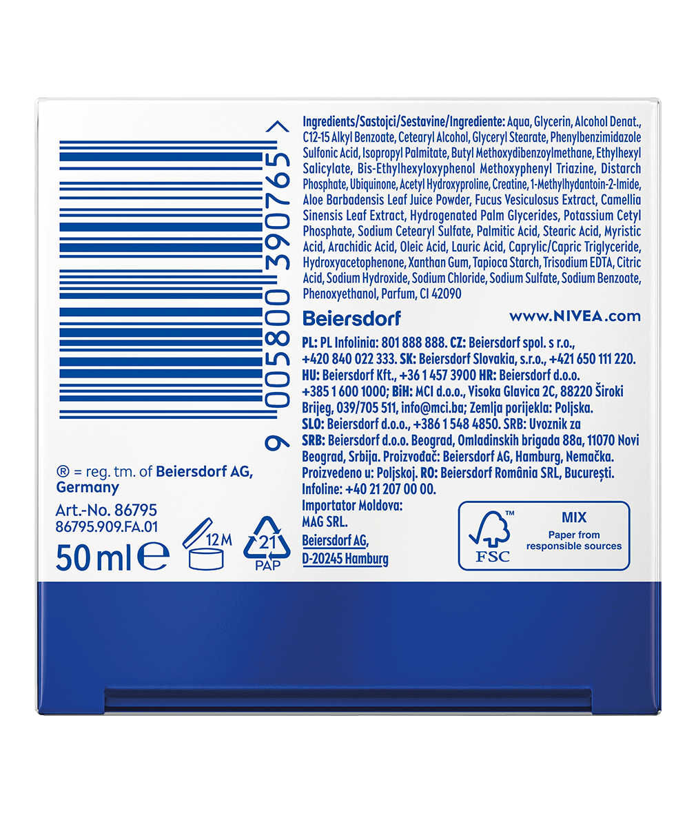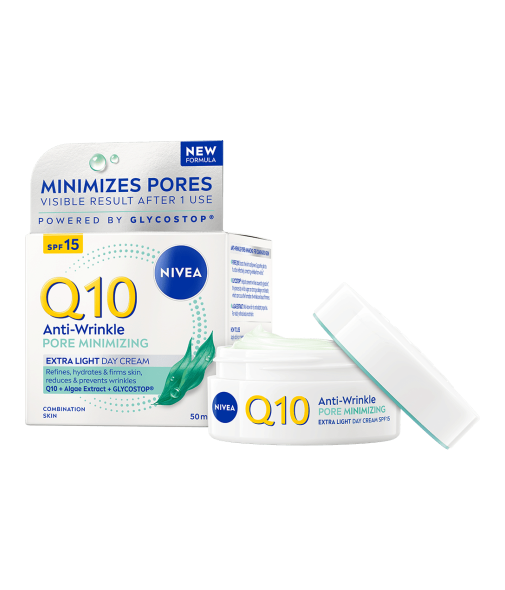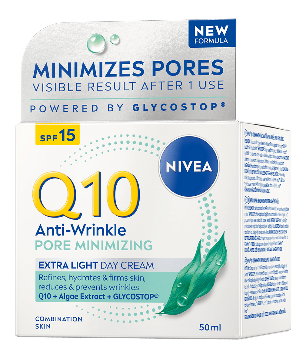 NIVEA Q10 PRZECIWZMARSZCZKOWE WYGŁADZENIE Ekstra lekki krem na dzień dla skóry mieszanej z SPF15 nawilża, ujędrnia skórę i zmniejsza widoczność porów jednocześnie redukując zmarszczki. Matowa i jednolita skóra. Efekty widoczne po 24 godzinach**.