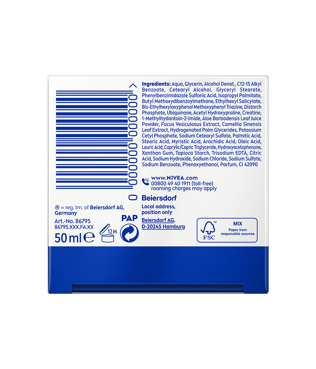 Zawiera: Aqua, Glycerin, Alcohol Denat, C12-15 Alkyl Benzoate, Cetearyl Alcohol, Glyceryl Stearate, Phenylbenzimidazole Sulfonic Acid, Isopropyl Palmitate, Butyl Methoxydibenzoylmethane, Ethylhexyl Salicylate, Bis-Ethylhexyloxyphenol Methoxyphenyl Triazine, Distarch Phosphate, Ubiquinone, Acetyl Hydroxyproline, Creatine, 1-Methylhydantoin-2-Imide, Aloe Barbadensis Leaf Juice Powder, Fucus Vesiculosus Extract, Camellia Sinensis Leaf Extract, Hydrogenated Palm Glycerides, Potassium Cetyl Phosphate, Sodium Cetearyl Sulfate, Palmitic Acid, Stearic Acid, Myristic Acid, Arachidic Acid, Oleic Acid, Lauric Acid, Caprylic/Capric Triglyceride, Hydroxyacetophenone, Xanthan Gum, Tapioca Starch, Trisodium EDTA, Citric Acid, Sodium Hydroxide, Sodium Chloride, Sodium Sulfate, Sodium Benzoate, Phenoxyethanol, Parfum, CI 42090