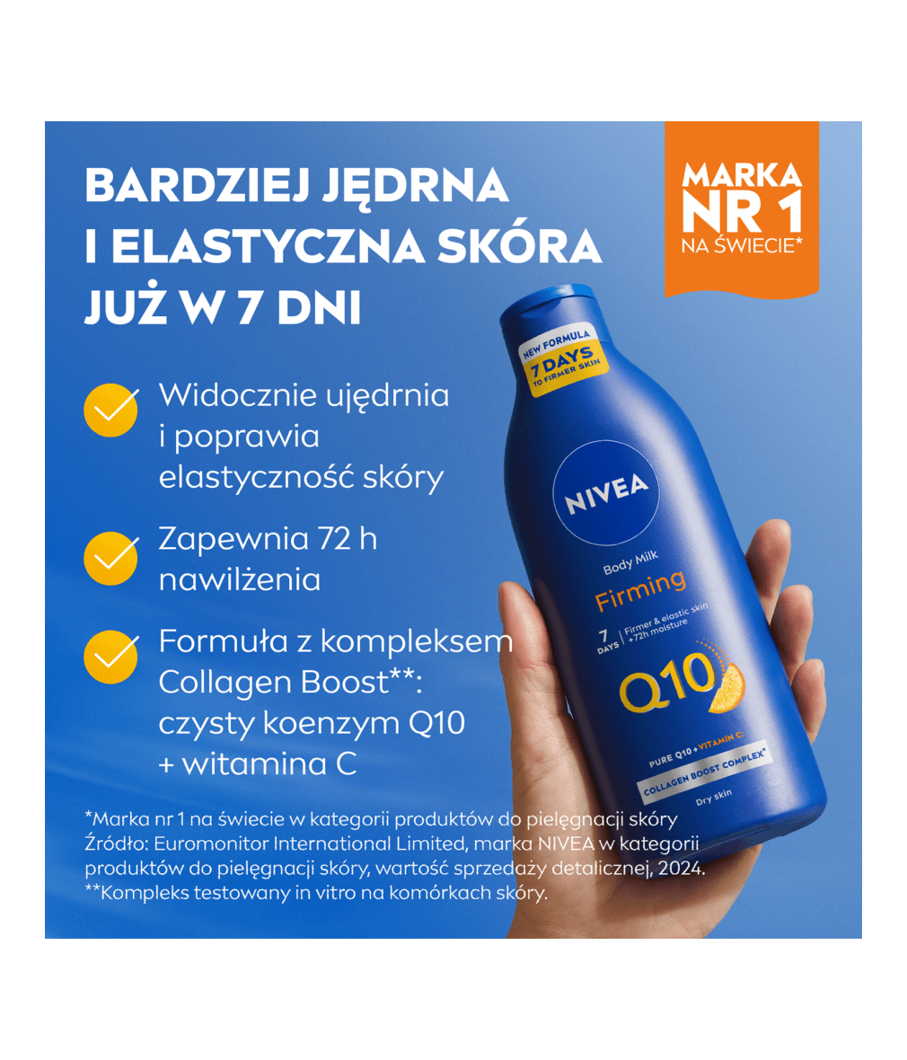Mleczko do ciała NIVEA Q10 z ulepszoną formułą z kompleksem Collagen Boost* zauważalnie ujędrnia i poprawia sprężystość skóry już po 7 dniach stosowania! Poczuj jak Twoja skóra staje się bardziej jędrna i nawilżona dzięki formule bogatej w koenzym Q10 oraz witaminę C.