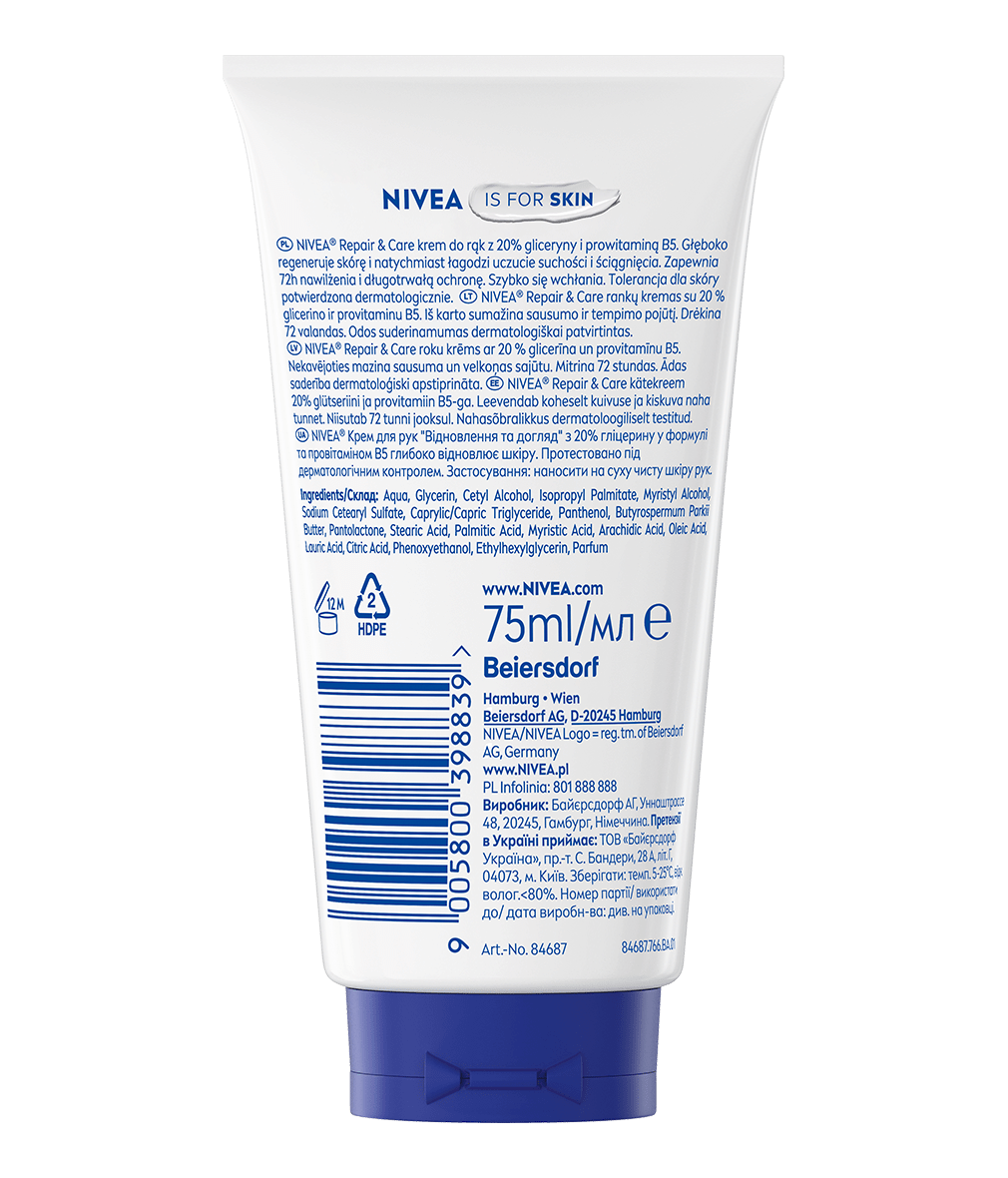 Krem do rąk NIVEA Repair & Care z 20% gliceryny i prowitaminą B5 przynosi natychmiastową ulgę ekstremalnie suchej skórze, głęboko regeneruje skórę i zapewnia długotrwałą ochronę. Zapewnia 72h nawilżenia i szybko się wchłania.