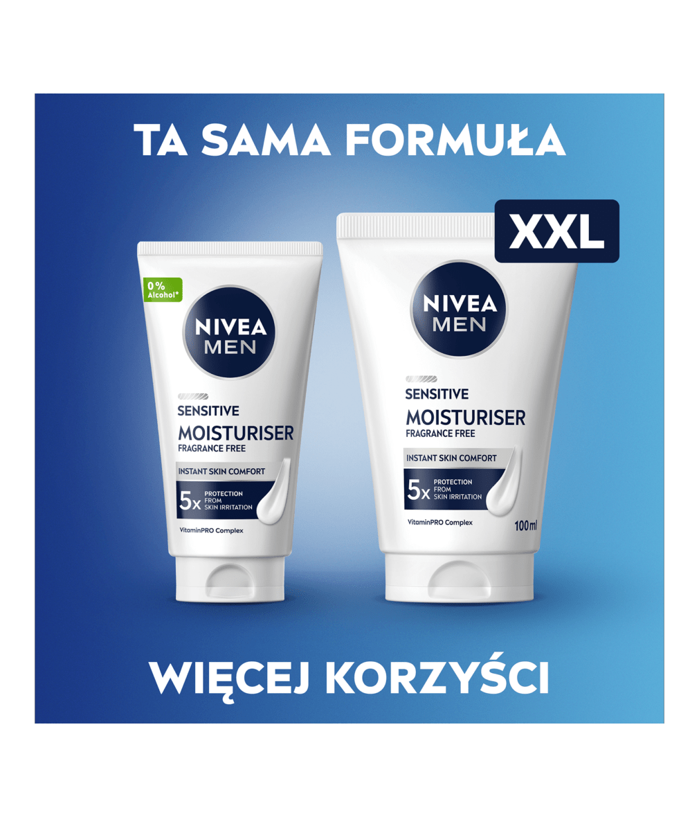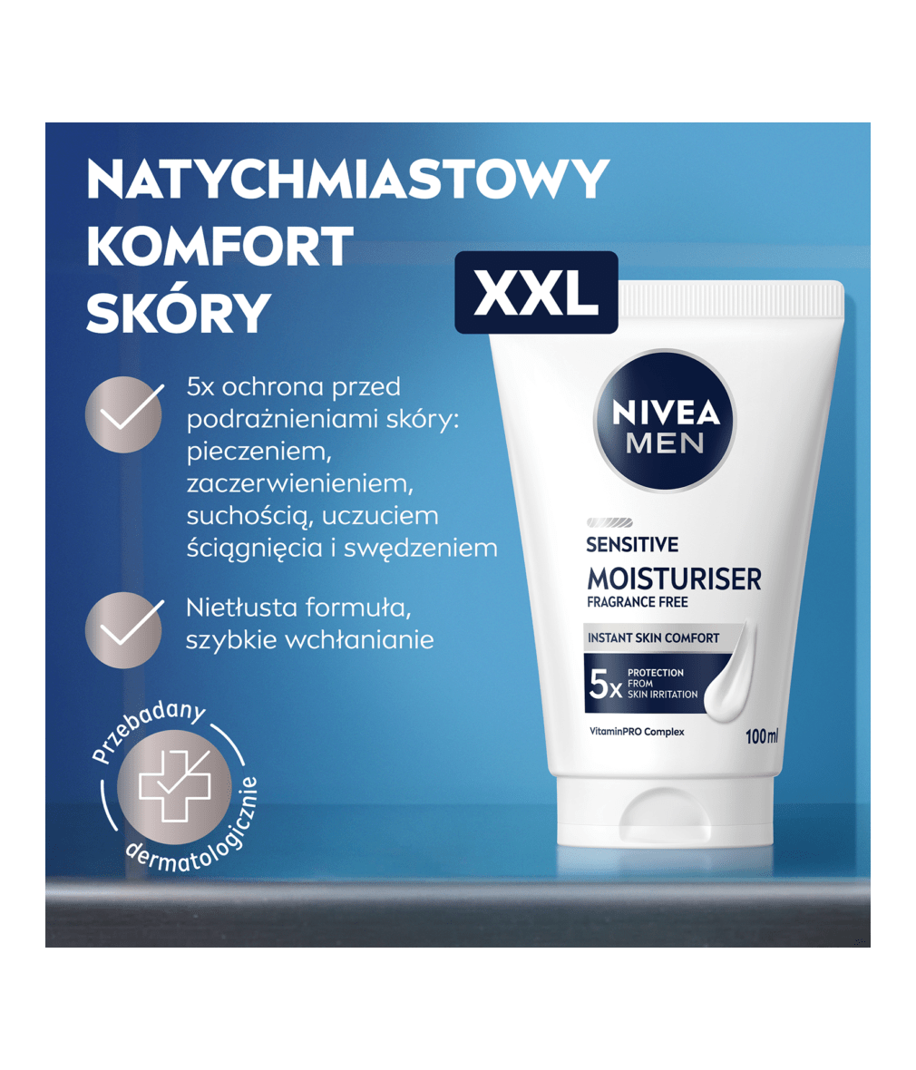 Łagodzący Krem nawilżający do twarzy NIVEA Sensitive XXL przeznaczony do pielęgnacji wrażliwej skóry przynosi ukojenie i długotrwałe nawilżenie. Jego delikatna formuła łagodzi podrażnienia i nie zawiera substancji zapachowych oraz alkoholu.
