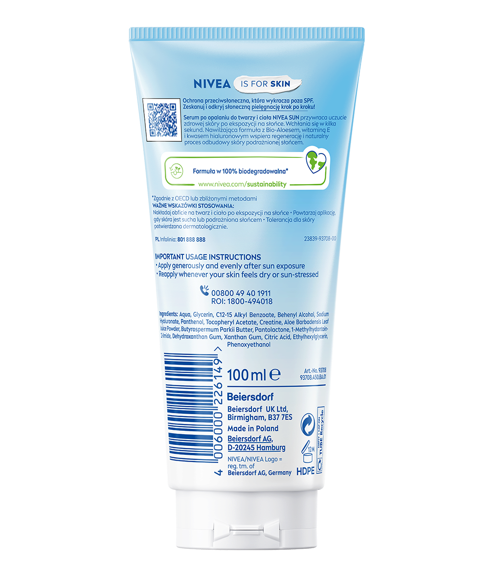 - Delikatna, bezzapachowa formuła z Bio Aloesem, Witaminą E i podwójnym działaniem Hialuronu, opracowana specjalnie z myślą o potrzebach skóry twarzy i ciała po ekspozycji na słońce