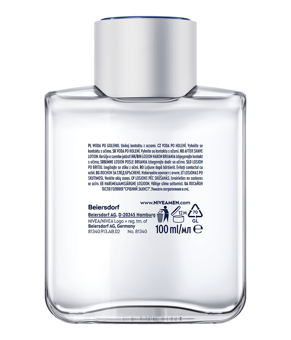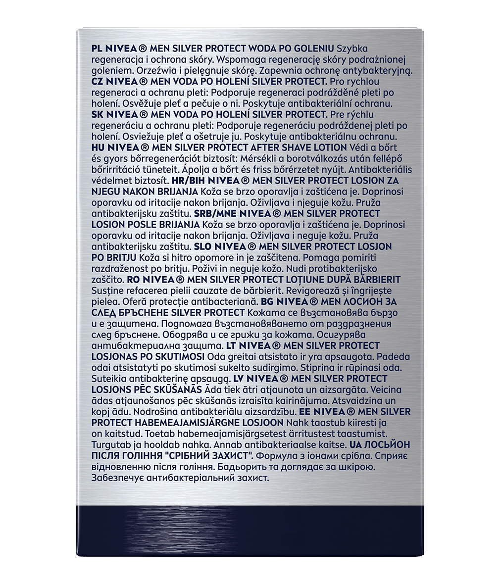 Wypróbuj NIVEA MEN Silver Protect Wodę po goleniu, która zapewnia szybką regenerację i ochronę skóry. Jej zaawansowana, lekka formuła z jonami srebra, rumiankiem i prowitaminą B5 orzeźwia i pielęgnuje skórę. Woda po goleniu Silver Protect wspomaga regenerację skóry podrażnionej goleniem, a także dzięki jonom srebra zapewnia ochronę antybakteryjną. Woda po goleniu zapewnia przyjemne uczucie odświeżenia i męski zapach. Skóra tuż po goleniu wygląda zdrowo i jest gładka i miękka w dotyku. Tolerancja dla skóry potwierdzona dermatologicznie. NIVEA® to ponad 100 lat doświadczenia w pielęgnacji skóry oraz starannie wyselekcjonowane składniki z zachowaniem najwyższych standardów jakości.