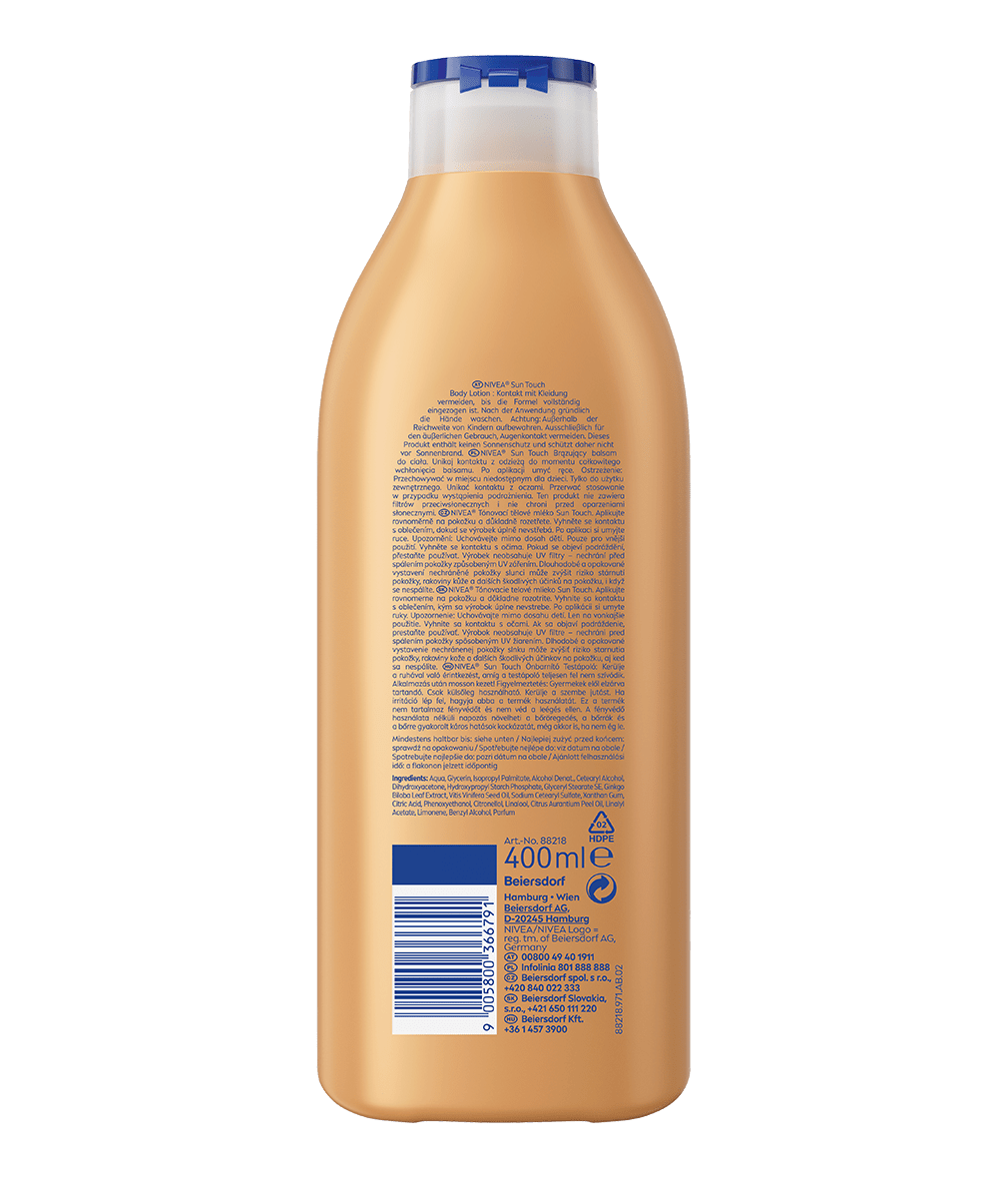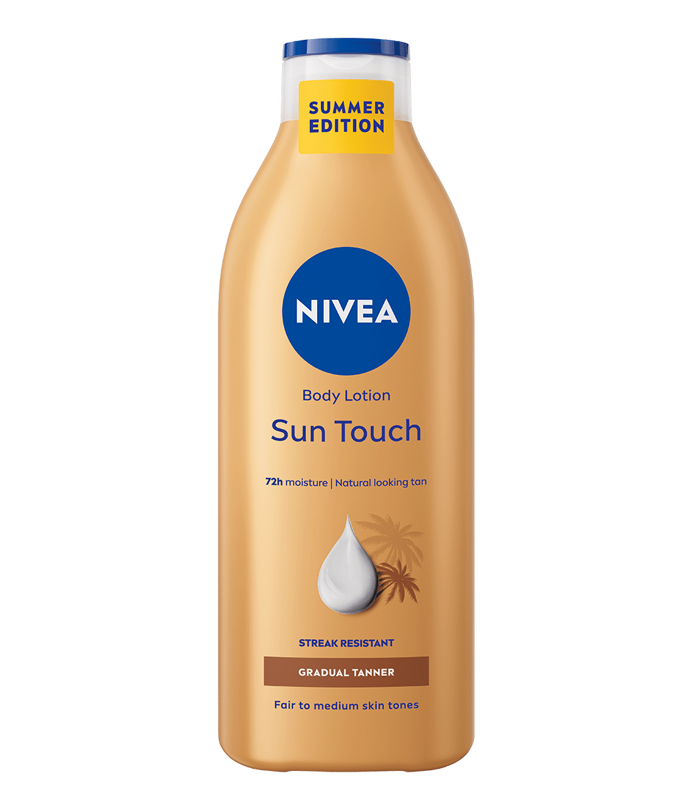 Brązujący balsam do ciała NIVEA Sun Touch głęboko odżywia i zauważalnie nawilża Twoją skórę na 72h! Poczuj jak Twoja skóra staje się doskonale nawilżona, a także ma równomierną i naturalnie wyglądającą opaleniznę, dzięki balsamowi Sun Touch