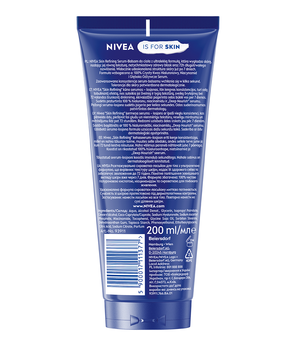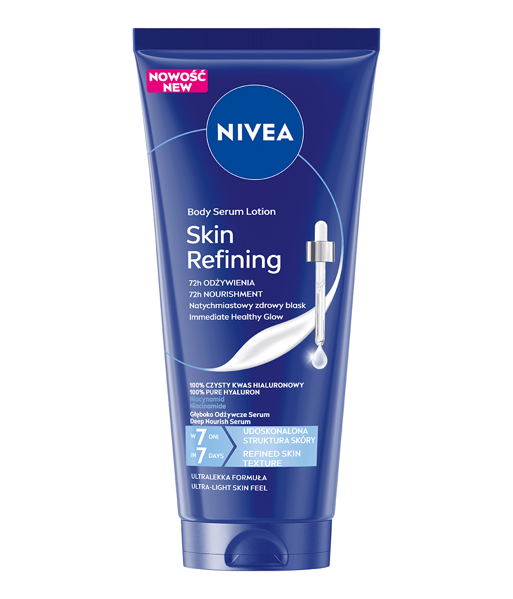 NIVEA Skin Refining Serum-Balsam do ciała z ultralekką formułą, który wygładza skórę, nadając jej równą teksturę, natychmiastowy zdrowy blask oraz 72h długotrwałego nawilżenia. Widocznie udoskonalona struktura skóry już po 7 dniach!