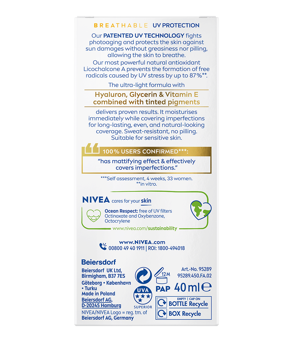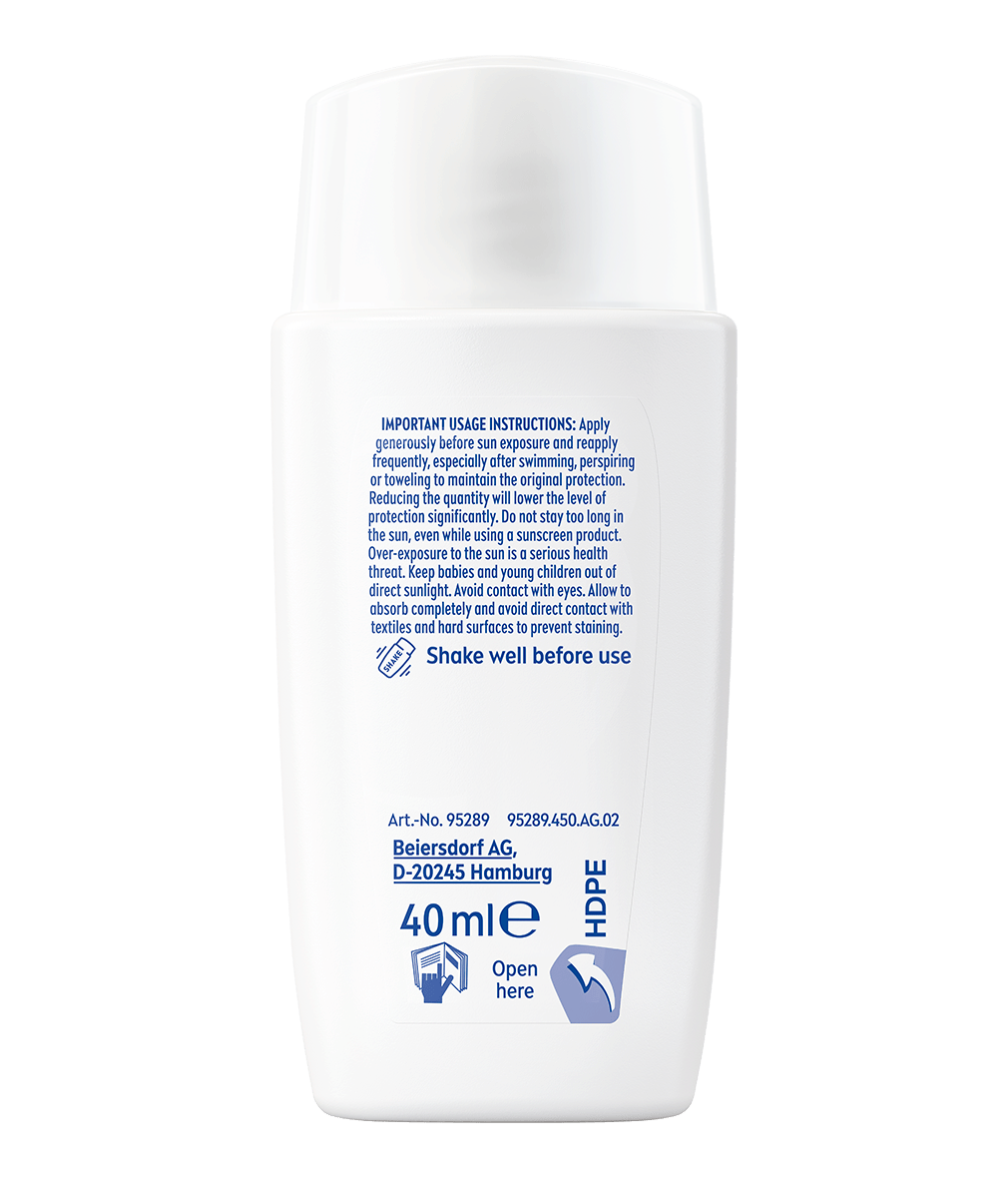 Innowacyjna, ultra-lekka formuła przeciwsłoneczna NIVEA Ultra Light Daily Fluid Medium Tinted z bardzo wysoką ochroną SPF50+. Chroni zdrową skórę przed promieniami UVA/UVB. Idealna do codziennego stosowania i reaplikacji. Dla każdego typu skóry.