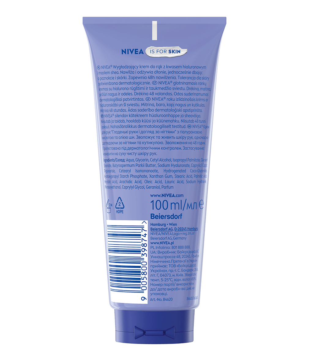 Wygładzający krem do rąk i paznokci z kwasem hialuronowym i masłem shea wzmacnia barierę ochronną skóry, pozostawiając Twoje dłonie miękkie i gładkie. Zapewnia 48h nawilżenia. Szybko się wchłania. Odpowiedni dla skóry suchej.