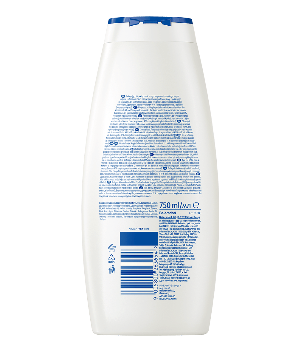 Pielęgnujący żel pod prysznic o owocowym zapachu pomarańczy z witaminami C & E i drogocennym olejkiem z awokado, który dba i chroni Twoją skórę przed wysuszeniem zachowując równowagę jej mikrobiomu.