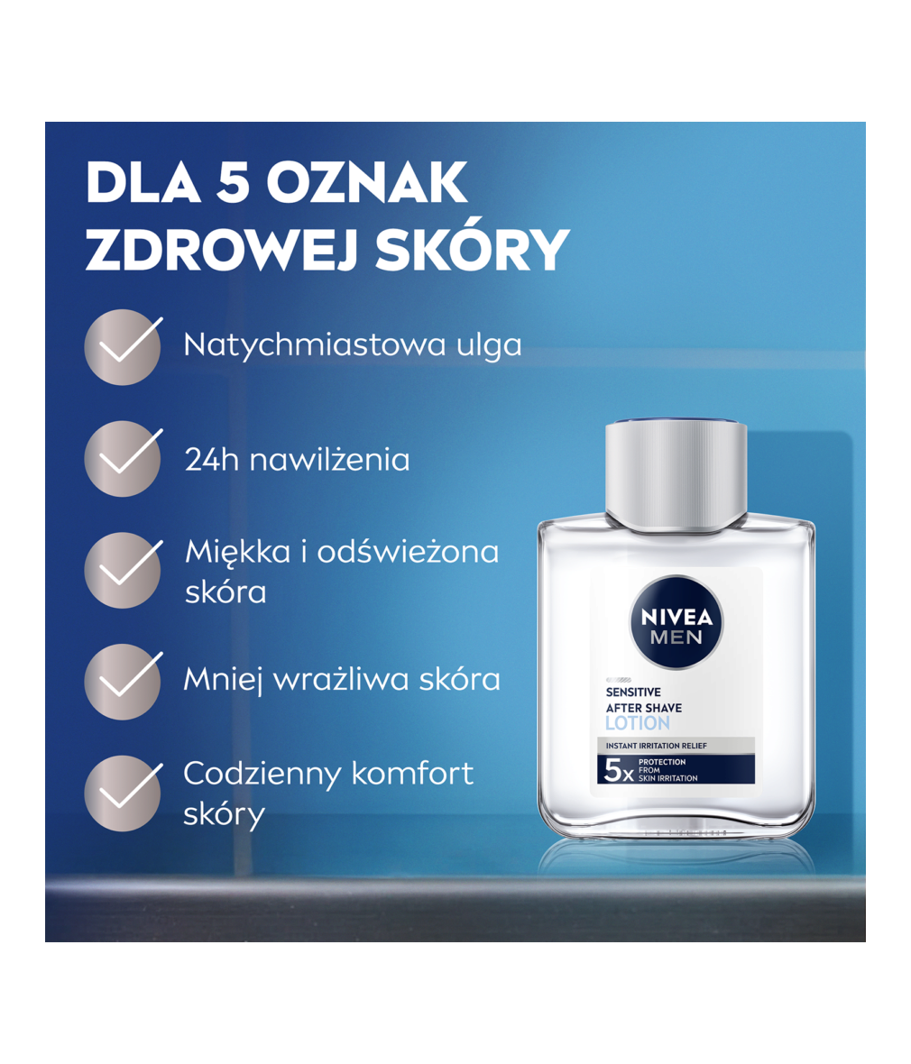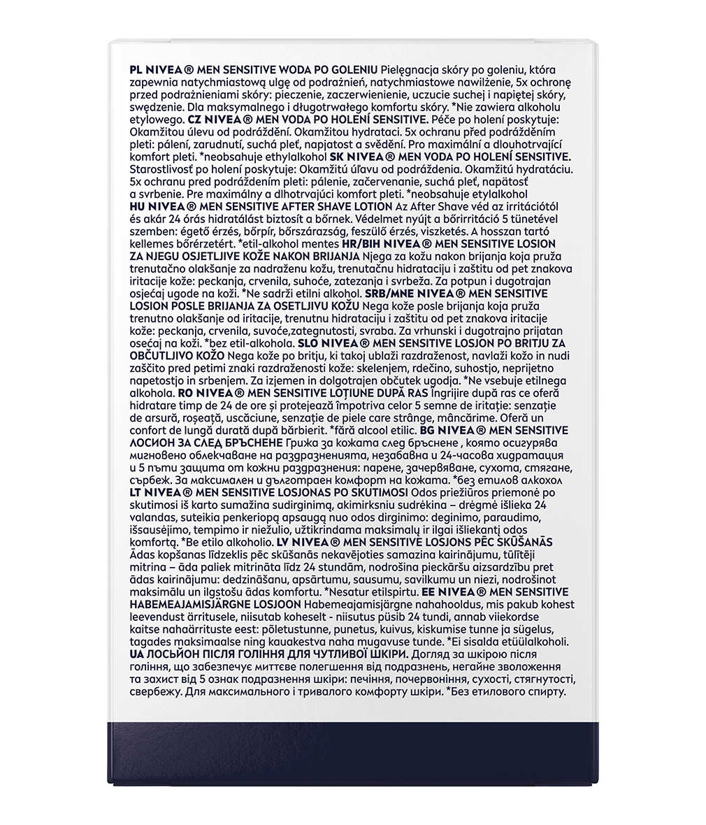 NIVEA MEN Łagodząca woda po goleniu Sensitive stworzona specjalnie z myślą o natychmiastowym ukojeniu podrażnionej skóry. Woda po goleniu nie zawiera alkoholu, dzięki czemu Twoja skóra nie będzie narażona na uczucie pieczenia.