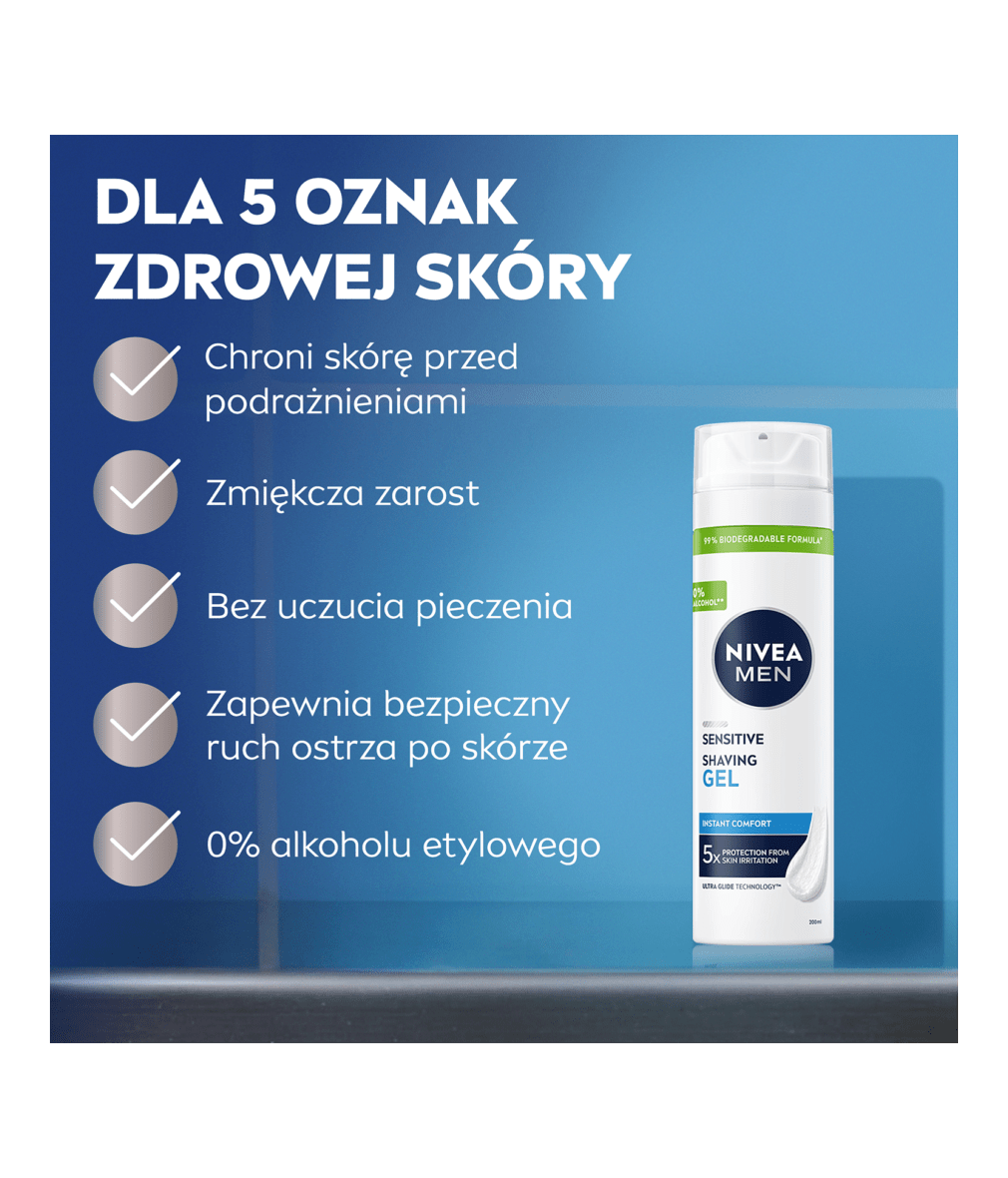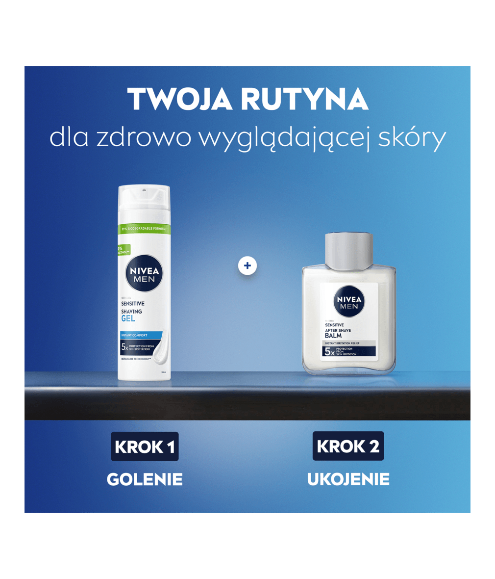Łagodzący żel do golenia NIVEA MEN Sensitive chroni wrażliwą skórę twarzy i przygotowuje ją do komfortowego golenia, bez uczucia pieczenia. Formuła z kompleksem VitaminPro i bez alkoholu etylowego. Zaufaj jakości NIVEA MEN!