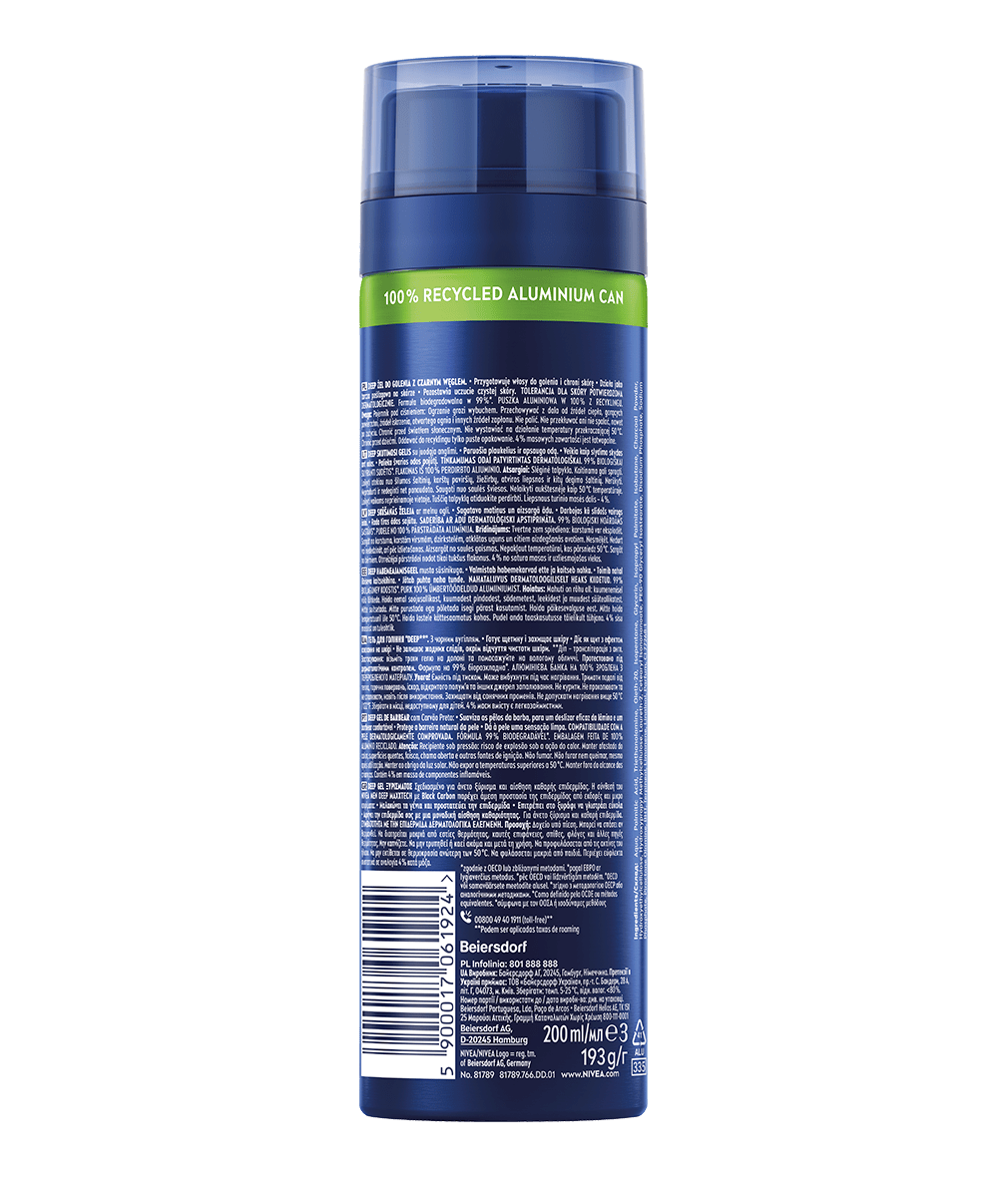 Zawiera: Aqua, Palmitic Acid, Triethanolamine, Oleth-20, Isopentane, Glycerin, Isopropyl Palmitate, Isobutane, Charcoal Powder, Hydroxyethylcellulose, Hydroxypropyl Methylcellulose, Laureth-2, Cetearyl Isononanoate, PEG-90 Glyceryl Isostearate, Disodium Phosphate, Sodium Phosphate, Piroctone Olamine, BHT, Terpineol, Limonene, Linalool, Parfum, CI 77268:1